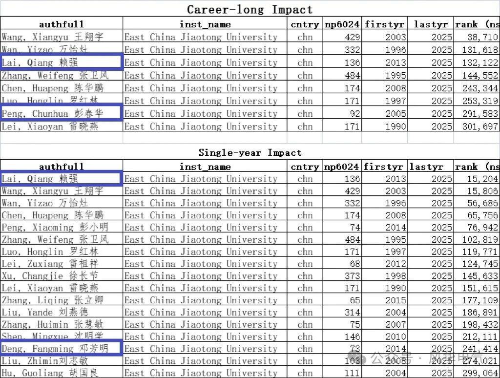 据了解,全球前2%顶尖科学家榜单分为“终身科学影响力排行榜”和“年度科学影响力排行榜”两大部分,从全球近700万名科学家中,通过基于其论文引用数、h因子、合著者修正的hm因子、单独或第一作者的文章引用数等综合参数,遴选出世界排名前2%的科学家,涵盖22个领域和174个子领域。其中,“终身影响力”榜单统计科学家职业生涯期间的综合表现,“年度影响力”榜单则聚焦上一年度的学术影响力。
