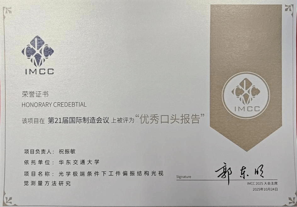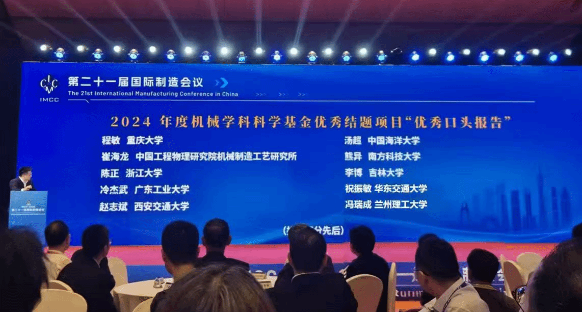 2025年10月23-26日,第二十一届国际制造会议(IMCC2025)在广州召开。会议期间,国家自然科学基金委员会机械设计与制造学科依托本次会议举办优秀结题项目报告会和成果展示。2024年度国家自然科学基金机械工程学科1000多项结题项目中评选出10项优秀结题项目“优秀口头报告”。我院祝振敏教授在大会上作了国家自然科学基金项目“光学极端条件下工件偏振结构光视觉测量方法研究”的邀请报告,并荣获优秀结题项目“优秀口头报告”。