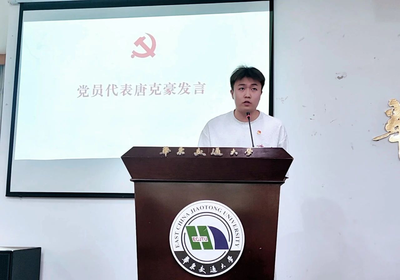 党员代表唐克豪发表讲话。作为党员先锋,他强调党员身份并非荣耀的象征,而是一份沉重的责任。他提出,我们应立足本职工作,将平凡事务做到极致,从而成就非凡。通过实际行动,承担责任。在学习的道路上不断自我展现、自我提升、自我完善,为全面建设社会主义现代化国家贡献青春力量。