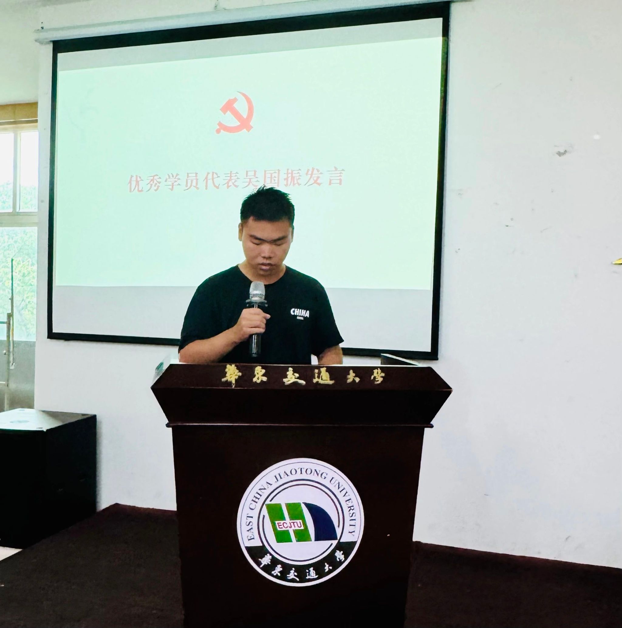 优秀学员代表吴国振同学发言,他分享了此次党课培训学习期间的感悟和收获,并代表全体学员,向辛勤培育他们的学校、学院和无私奉献的老师们致以敬意和感谢!他郑重表态:“我们以此次党课结业为起点,把课堂里的理论认知转化为冲锋的号角,把实践中的红色基因化作前行的动力,以“请党放心,强国有我”的铿锵誓言,书写属于我们这代人的青春华章!”