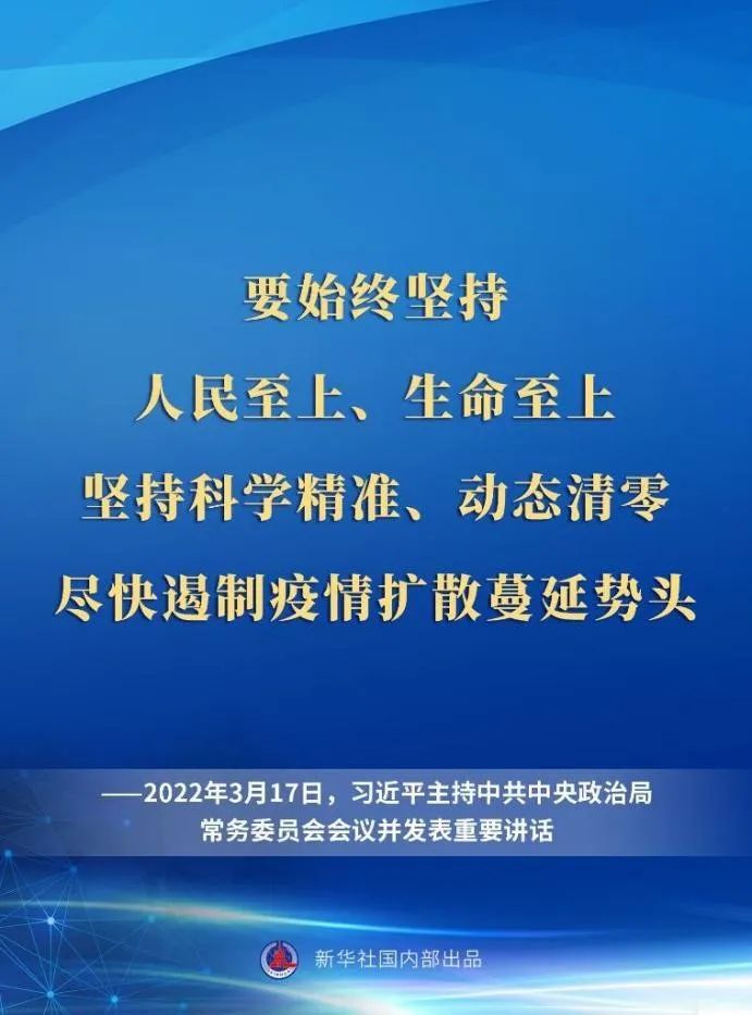 在严峻复杂的疫情防控时刻,习近平总书记强调,要始终坚持人民至上、生命至上,坚持科学精准、动态清零,尽快遏制疫情扩散蔓延势头。习近平总书记还强调,要保持战略定力,坚持稳中求进,统筹好疫情防控和经济社会发展,采取更加有效措施,努力用最小的代价实现最大的防控效果,最大限度减少疫情对经济社会发展的影响。