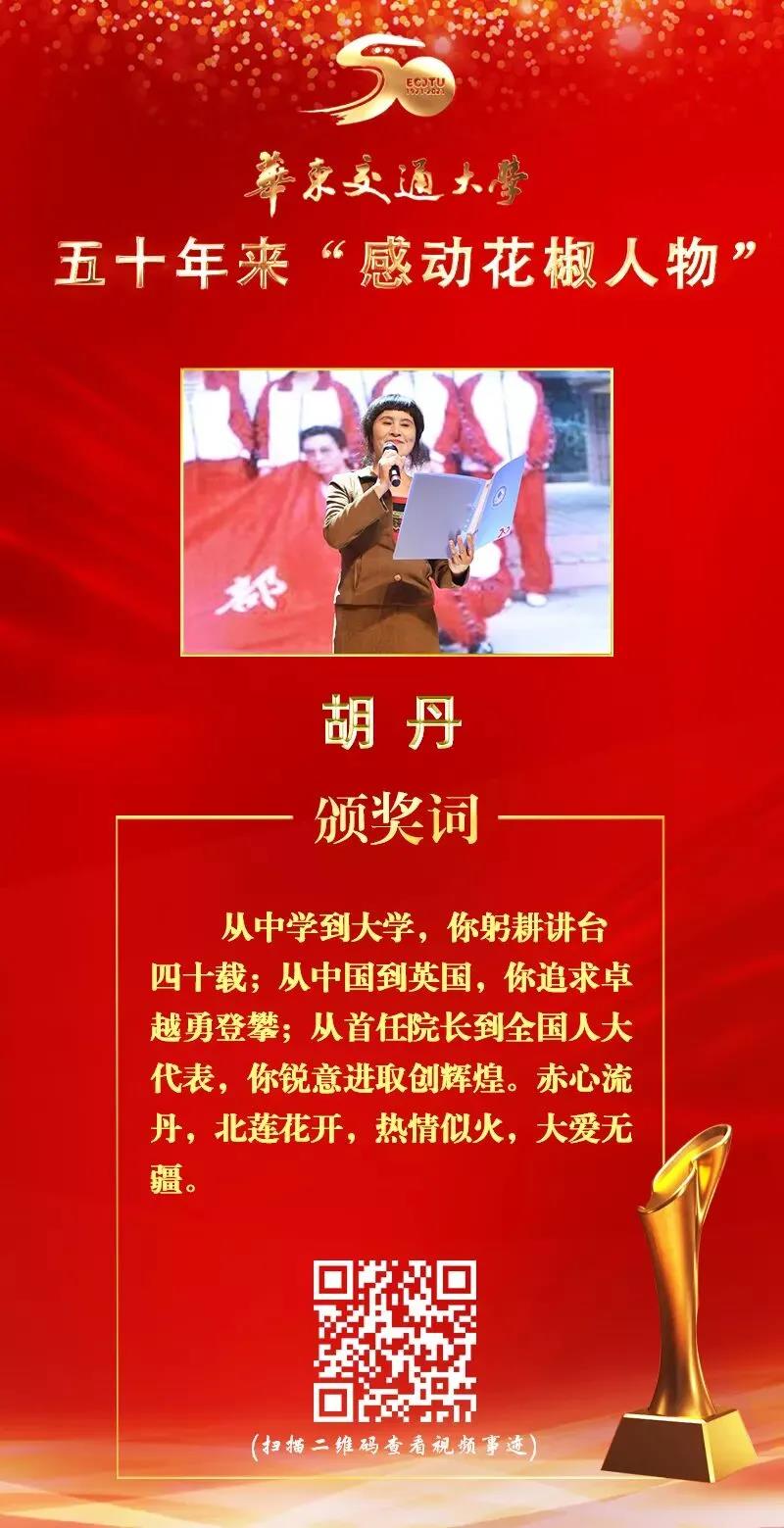 胡丹老师曾考上了长沙铁道学院(现中南大学)外语系,毕业后选择来到华东交大当一名英语教师。而她这一当就是三十年,在这三十年中,我校的公共外语教研室发展成了现在的外语学院,英语四级通过率也超全国同类水平学校。这一切的成就都离不开胡老师的付出,她默默奉献,不求回报,使知识得以传承,美德得以延续。她用语言播种,用粉笔耕耘,用辛劳浇灌,用心血滋润。作为华交学子,我将努力学习科学文化知识,积极进取,不断创新,不负老师的谆谆教导,不负老师的殷切期望!