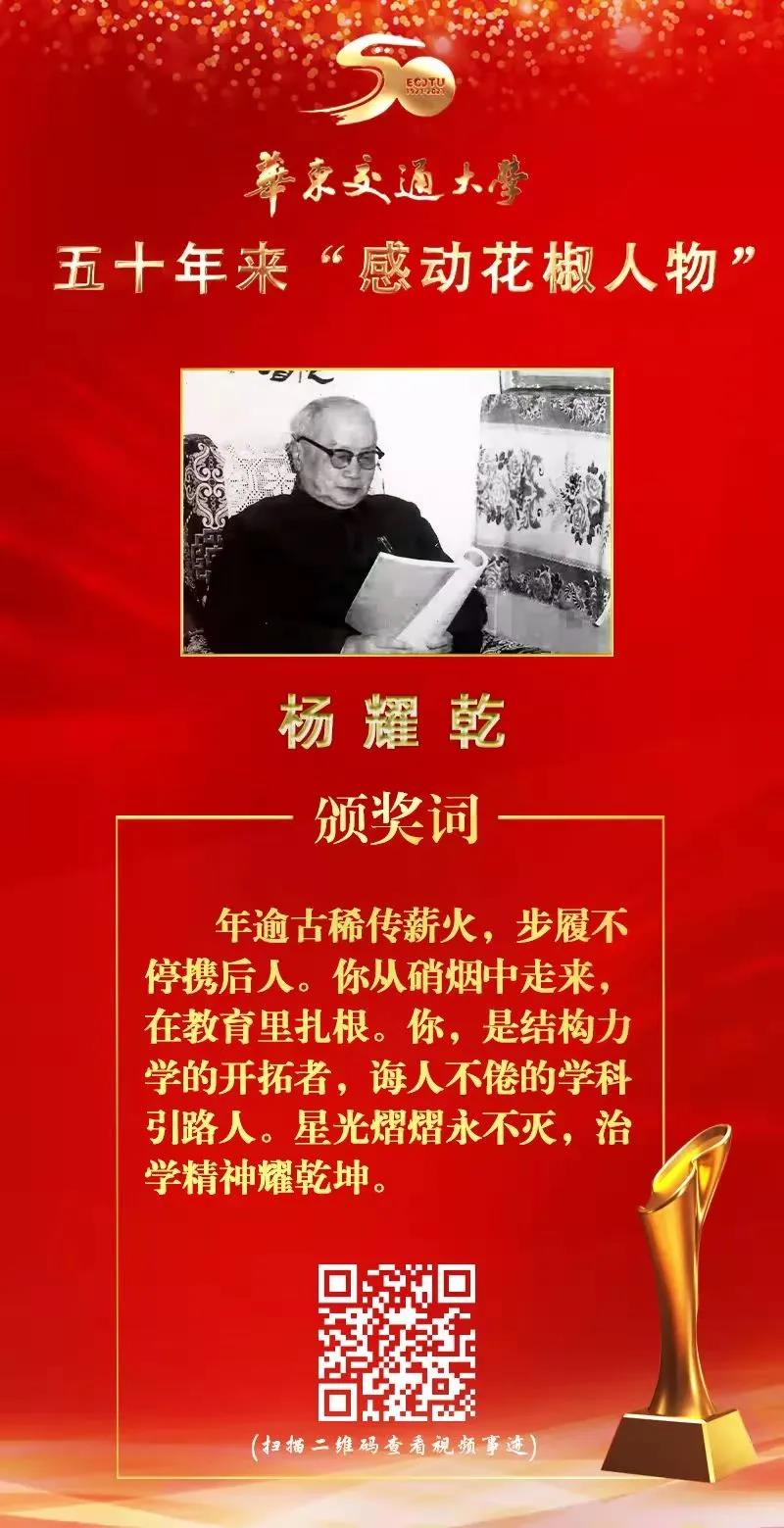 杨耀乾为华东交大倾尽自己,带起整个学校的教学科研发展,直至退休后依然默默地为华东交大贡献自己的力量。身为一名学生党员,应当在学习与生活中去践行无私奉献精神,努力提高自己的人生价值,争取为交大,为社会,为国家贡献自己的青春力量。