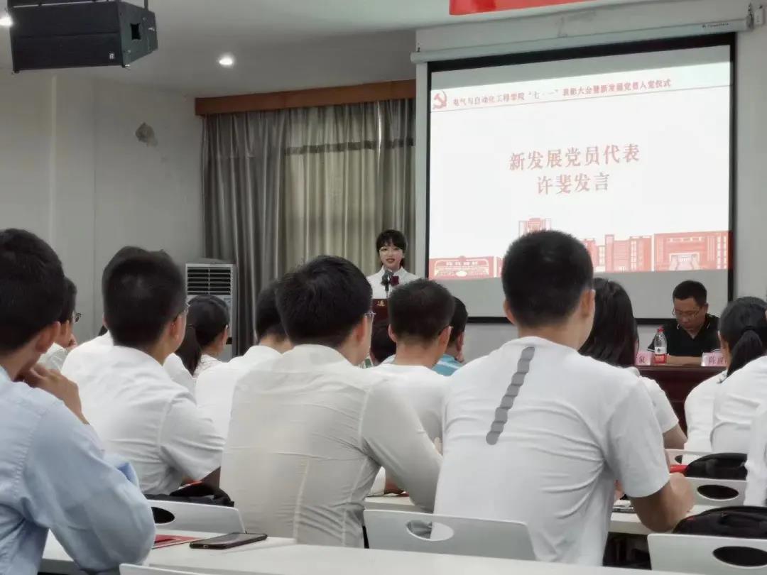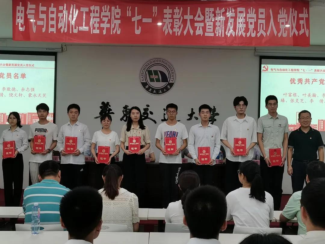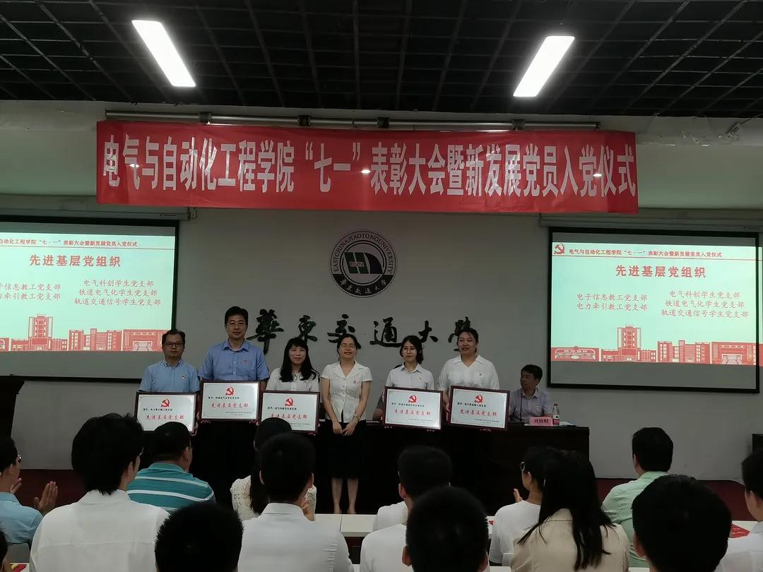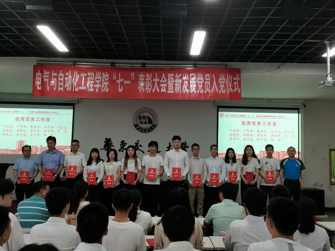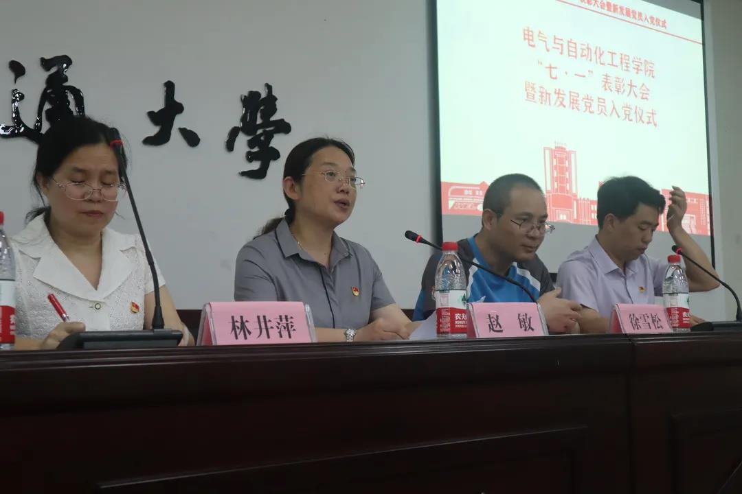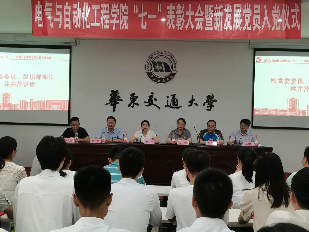 为庆祝建党百年,进一步推进党史学习教育,2021年6月30日,6776永利集团于天佑会堂举行“七一”表彰大会暨新发展党员入党仪式。校党委委员、组织部部长林井萍及电气学院党委领导班子出席大会,电气学院各基层党支部书记、师生党员代表参加大会。