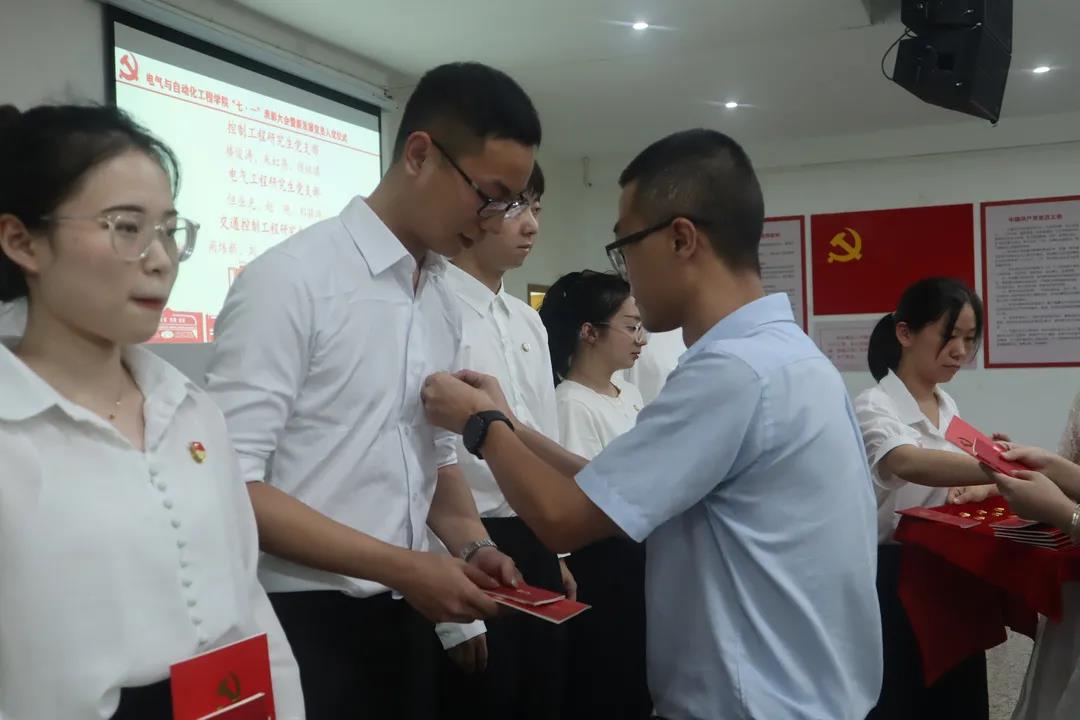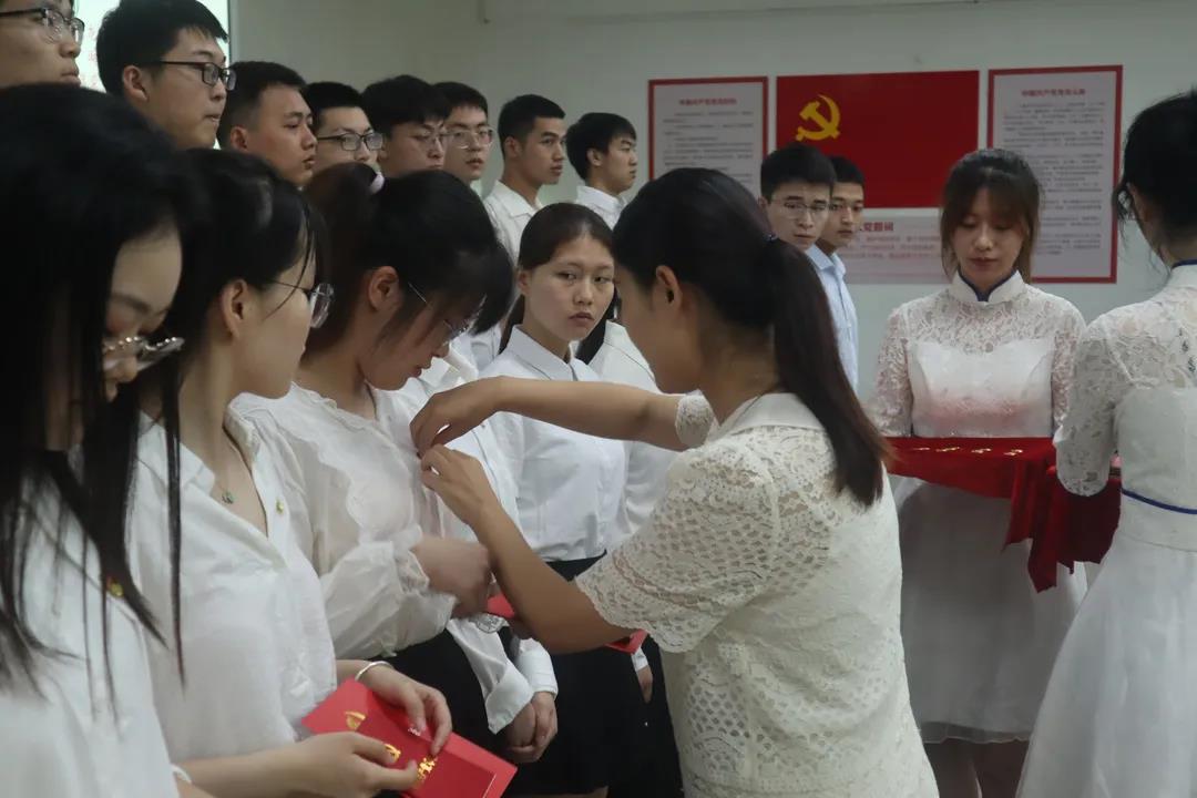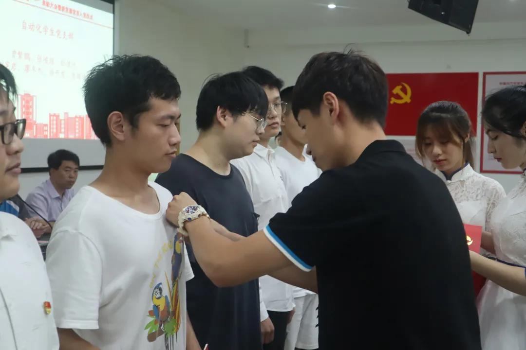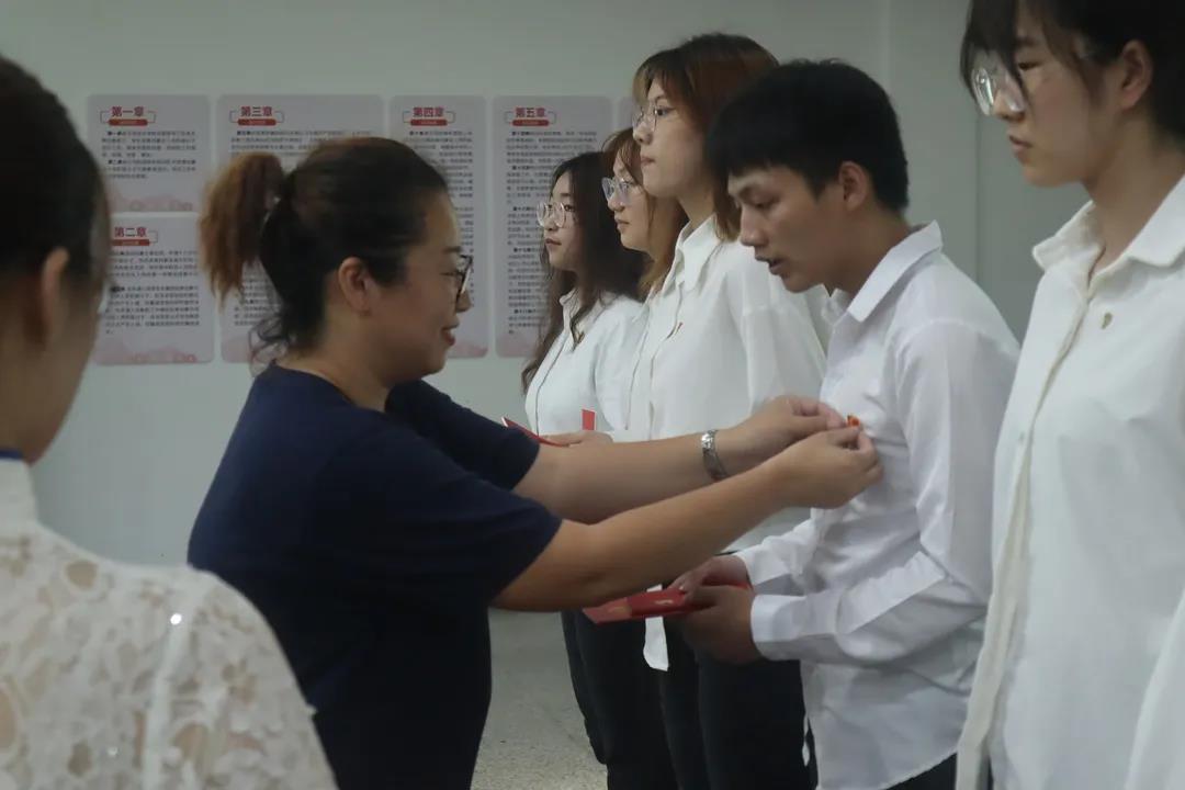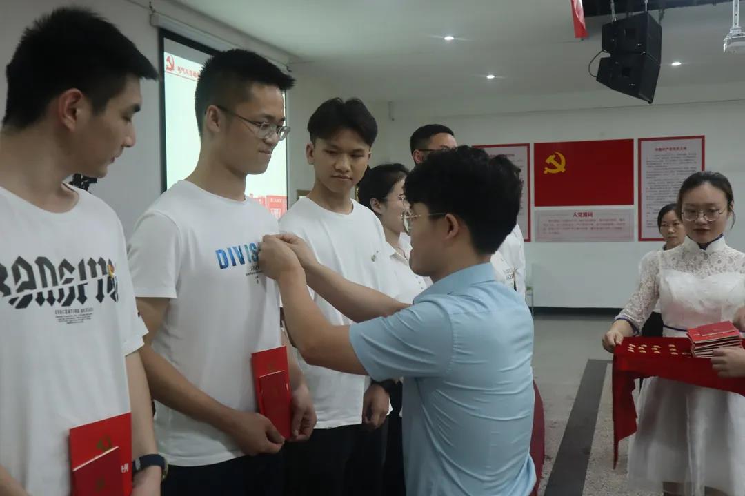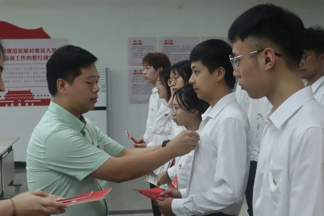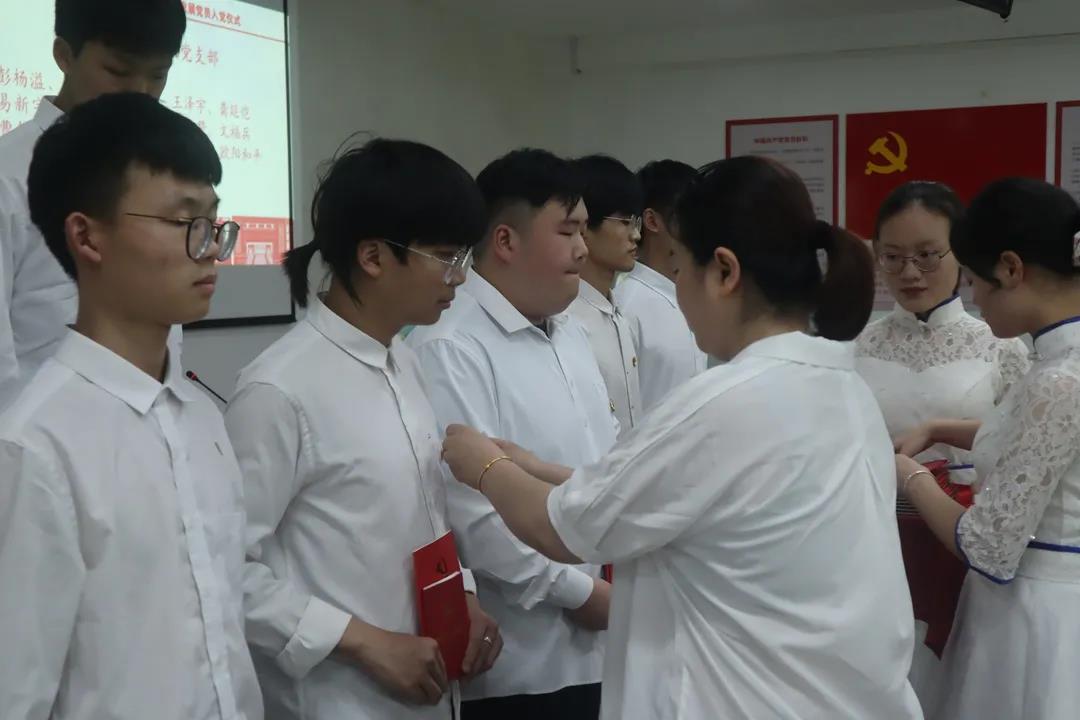 陈世明宣读新发展党员名单,各支部书记为本支部新发展的党员同志佩戴党徽,并为他们赠送《中国共产党章程》及《中国共产党纪律处分条例》。