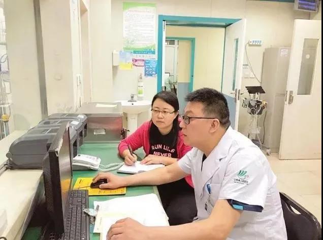 山西日报记者秦洋(左)正在急诊监护室工作站采访段治中