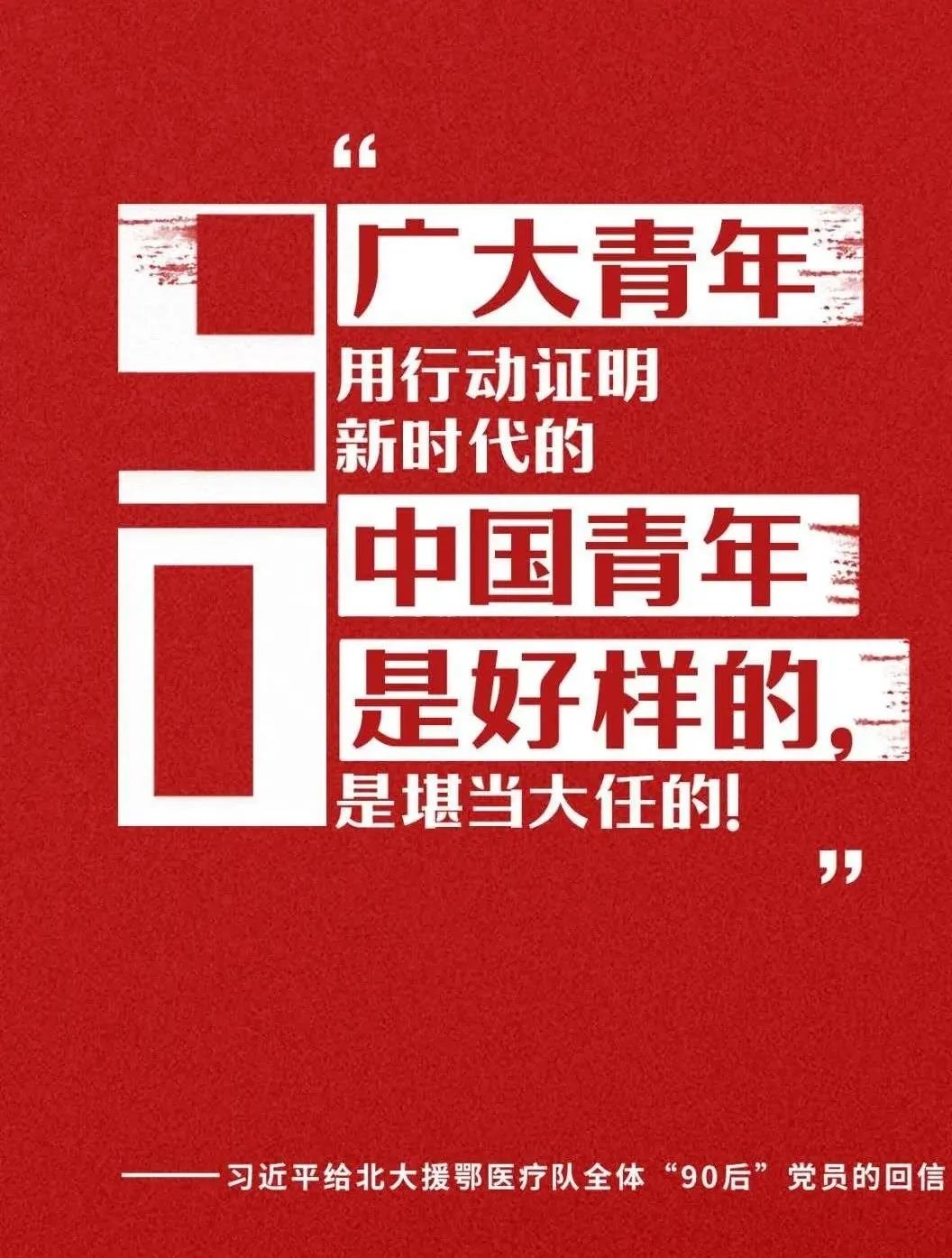 习近平总书记在给北京大学援鄂医疗队全体“90后”党员回信中指出,“在新冠肺炎疫情防控斗争中,你们青年人同在一线英勇奋战的广大疫情防控人员一道,不畏艰险、冲锋在前、舍生忘死,彰显了青春的蓬勃力量,交出了合格答卷。广大青年用行动证明,新时代的中国青年是好样的,是堪当大任的!