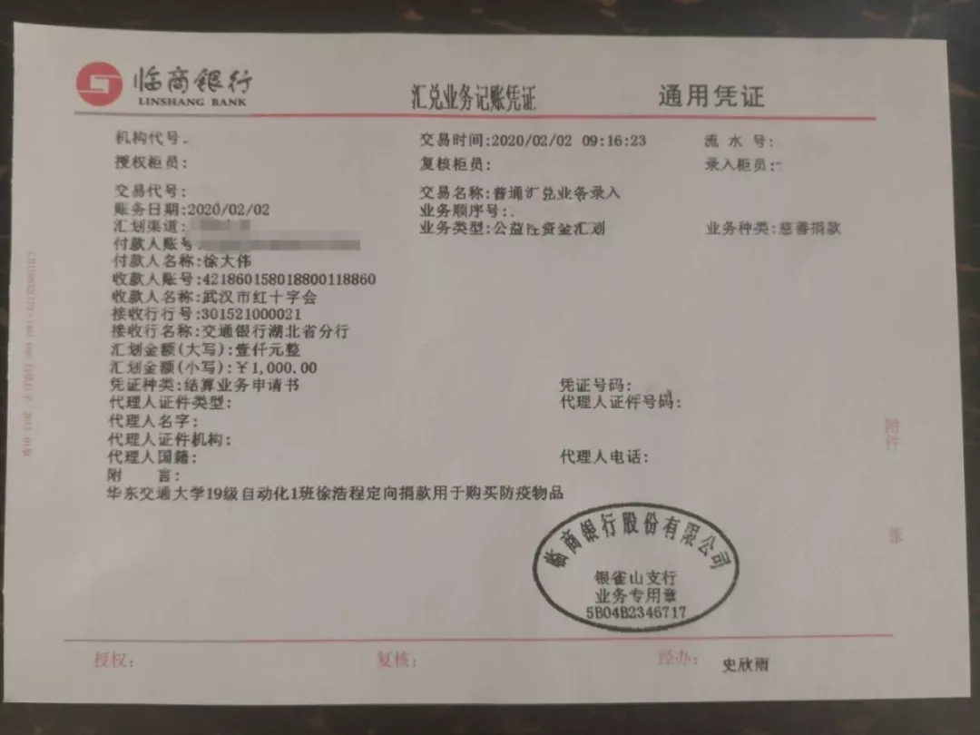 “我通过电视新闻了解到武汉的疫情变化,意识到这次疫情的严重性,我的家乡临沂确诊患者也不在少数,心里触动很大。”得到家里做医生的爷爷奶奶的支持,徐浩程决定向武汉捐款,“因为当时班级里也在组织捐款活动,我就和家人们商量通过银行汇款向武汉捐款,这些捐款将用于购买医疗物资。”