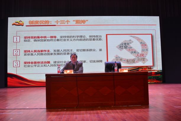宣讲会上,陈晓江围绕“制度”这一关键词对党的十九届四中全会精神进行阐述。他指出,要理解会议精神就必须紧扣“坚持、完善和发展中国特色社会主义制度,推进国家治理体系和治理能力的现代化”这一中心思想。