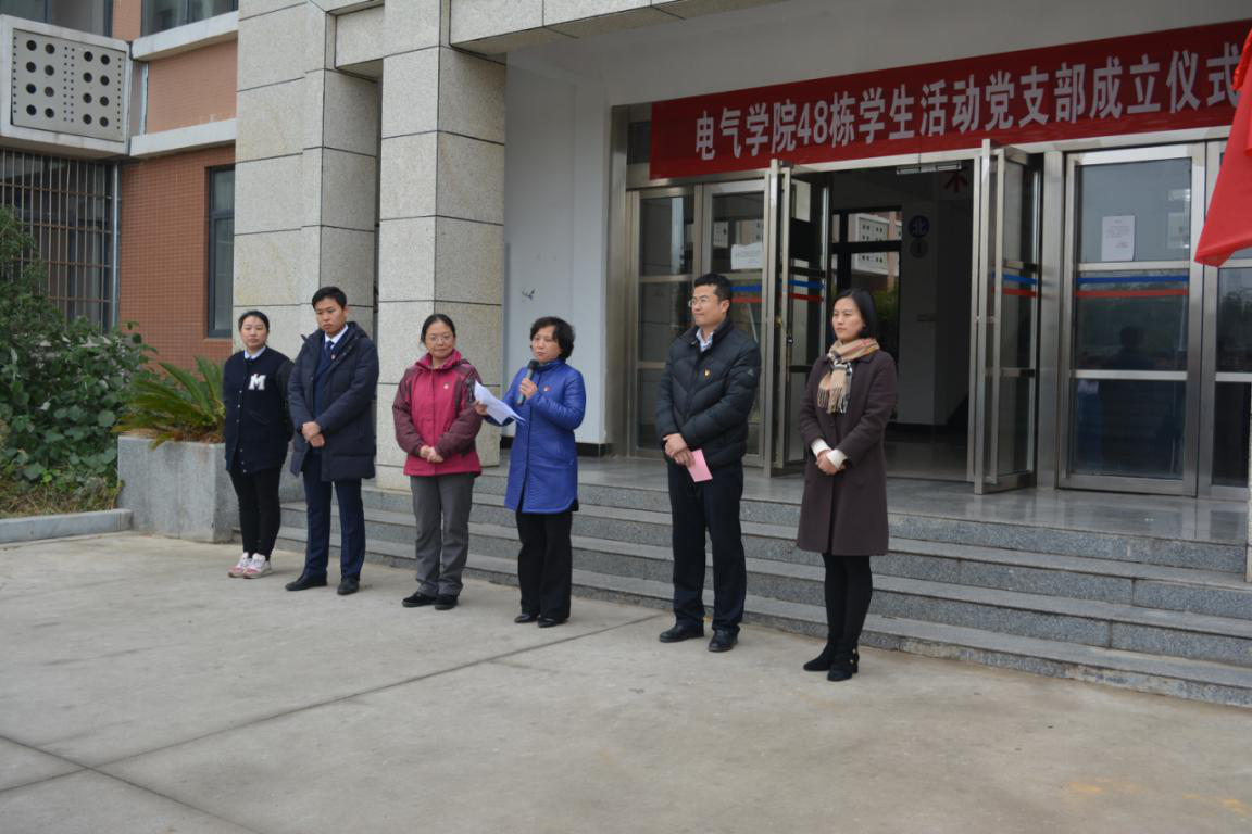 应学校党委《关于进一步加强学生工作的若干措施》文件要求,电气学院根据学生实际情况,结合宿舍党建工作经验,全面启动“党建进宿舍”工作。11月28日,电气学院学生活动党支部成立仪式于学生寝室48栋顺利举行。我校党委委员、纪委书记洪梅,我院党委书记赵敏,校团委副书记刘一南,院学工办主任兼团委书记郑洁出席本次成立仪式,仪式由院党委副书记王巍主持。