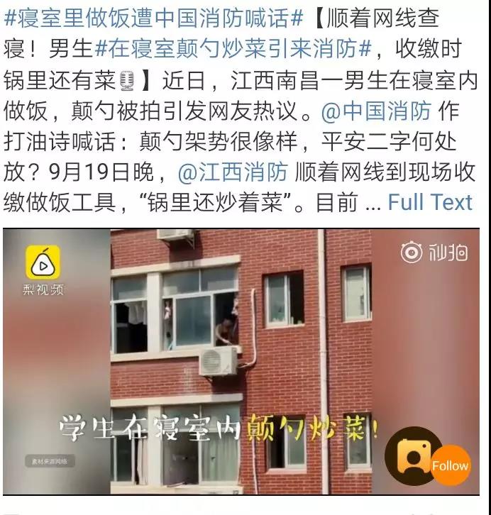 而在我们的身边,就在2019年9月19日晚,江西南昌一学生在寝室做饭,颠勺被拍引网友热议,@江西消防 到现场收缴做饭工具,一进门发现锅里还炒着菜。目前,学校通报称老师已对该同学进行了思想教育,该同学已认识到寝室安全的重要性。