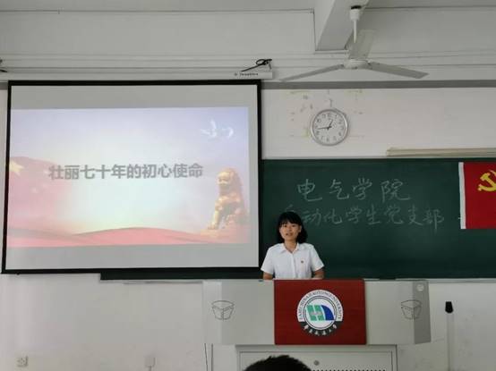 在中华人民共和国成立七十周年之际,回忆这七十年风雨兼程、七十年峥嵘岁月、七十年玉汝于成。日前,电气学院自动化学生党支部开展以“壮丽七十年、奋斗新时代”为主题的微党课,支部书记黎琰授课。