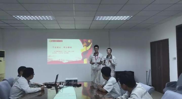 献礼祖国七十华诞,展现花椒党员风采。我是花椒学生党员李海宁,我是花椒电气学生党员叶美瀚。很高兴能在中车株机电气设备分公司交验车间实验班开展献礼祖国七十华诞的宣讲,我们今天的宣讲主题是“守初心、担使命、忆过去、再出发”
