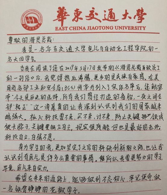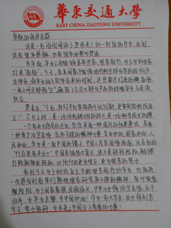 学习完信件并总结后,部分党员同志书写了对海思总裁致员工的信件的回信。回信内容深刻,阐明了作为大学生党员的先进性和危难关头临危不惧迎难而上的精神,作为当代大学生应该有的觉悟意识。