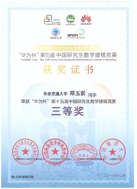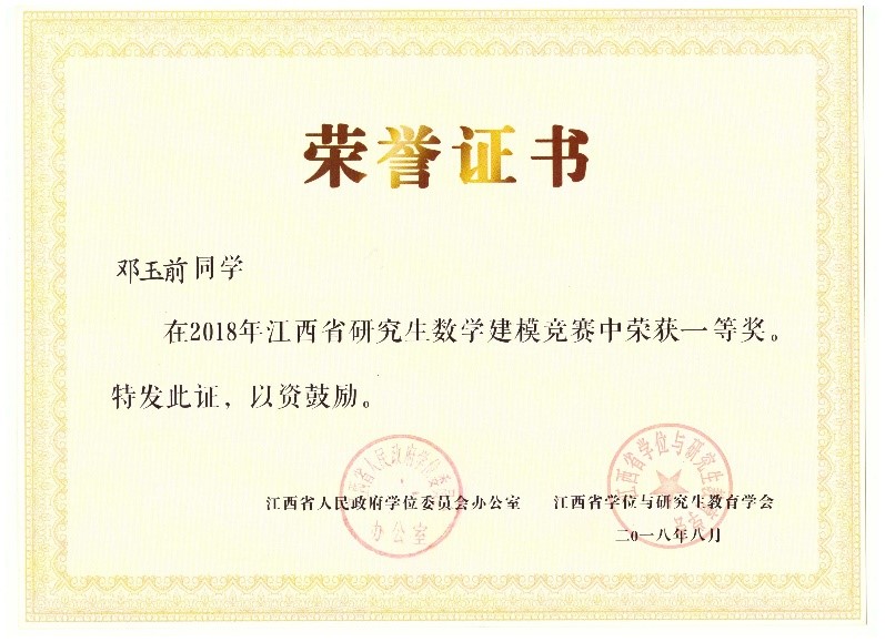 邓玉前,男,中共党员,2013级yl6776永利集团电子信息工程2班班长,2015年6月加入中国共产党。他目前是2017级交通信息工程及控制研究生,也是电气学院研究生交通党支部组织委员。在校期间,他多次获得优秀学生干部荣誉称号并积极参加学校的各种比赛,曾经获得江西省电子设计大赛三等奖、国家励志奖学金、校三等奖学金、江西省智能车竞赛三等奖等。进入研究生阶段,他更加严格要求自己,不断学习,深刻认识到自己首先在学习上做好才能更好地为同学服务的道理,因此,在导师的指导与其自身的努力学习下,研究生期间他获得江西省数学建模一等奖,全国数学建模三等奖、发表学术论文CSCD一篇,在投SCI学术论文一篇,在电气研究生中起到良好的模范榜样作用与带头作用。