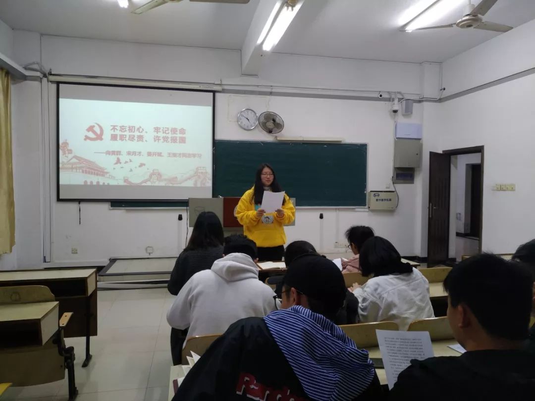 学生第五党支部胡美林同志表示,黄群、宋月才、姜开斌、王继才同志面对台风和巨浪挺身而出,英勇无畏, 为保护国家重点试验平台壮烈牲牺牲,用实际行动诠释了党员对党忠诚,恪尽职守。他们用生命坚守了一名党员的职责,践行了“随时准备为党和人民牺牲一切”的初心和誓言。王继才同志守岛卫国32年,用无怨无悔的坚守和付出,在平凡的岗位上书写了不平凡的华章。荒岛上的条件艰苦,26岁,一个正值青春美好的年纪,王继才选择用淳朴的行动履行一名民兵的责任。31年,他为了祖国的国土安全,为了锦秀河山奉献了自己的一生。英雄是时代的标杆,向英雄学习,以先进党员为榜样。他们的爱国奉献精神是我们新时代奋斗者的价值追求。我们要以黄群、宋月才、姜开斌、王继才为榜样,坚定理想信念,不忘初心、牢记使命。