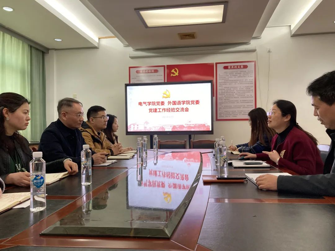 赵敏对外国语学院党委一行的到来表示热烈欢迎,对学院的基本情况、党建工作的做法及成效等进行了详细介绍,并分享了学院“红色电磁场”党建品牌的建设思路。赵敏指出,电气学院党委持续以基层党组织工作规范化为抓手,不断夯实基层党组织的建设,凝心聚力推进学院事业高质量发展。