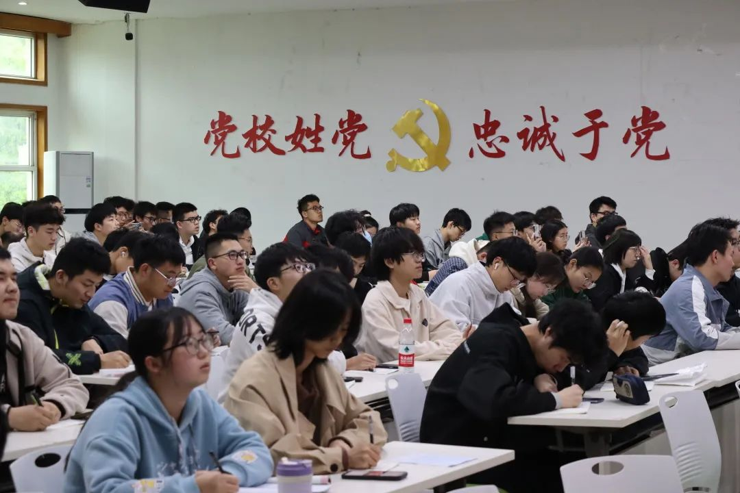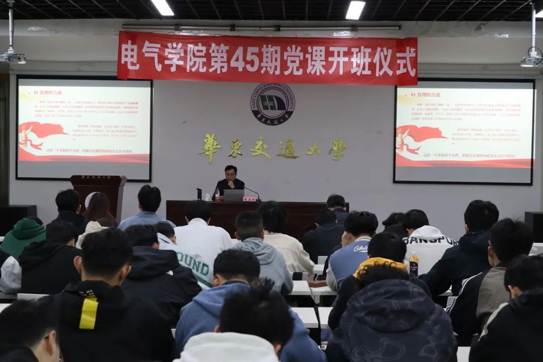 2023年4月6日,电气学院第45期党课培训班在天佑会堂举行,学校学工部部长、学工处处长吴正才为党课学员们讲授党课第四讲——十个视角看中国为什么“能”。