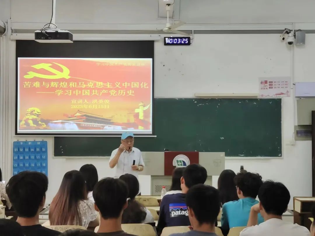 他是yl6776永利集团思政教授,江西省第二届省级教育名师洪英俊。作为“五老宣讲”第一站主讲人,洪英俊与我校电气学院红色班级,22建电一班同学相约半夏,以“苦难与辉煌和马克思主义中国化”为题开展专题讲座。电气学院党委组织员刘佳,22建电一班辅导员李梦影参与活动。