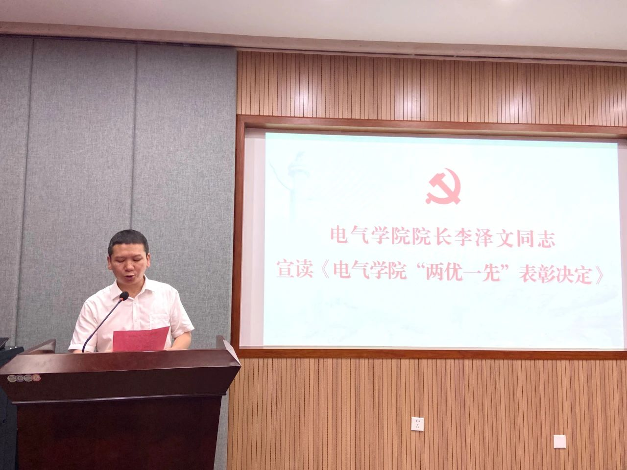 7月3日上午,电气学院举行“两优一先”表彰大会,表彰2021-2023年学院涌现出的优秀共产党员、优秀党务工作者和先进集体。学院全体教工党员和部分学生党员参加大会,院党委副书记刘修财主持会议。