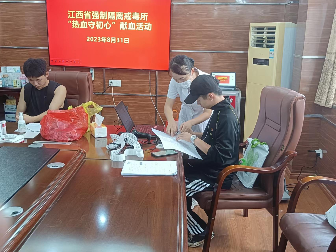 8月31日,省强戒所开展了“热血守初心”无偿献血活动,在电力牵引学生党支部学生党员的指引下,前来献血的警察同志有序地排队并填写《无偿献血登记体检表》,在填表后,党员志愿者为献血者冲泡糖水,提供饼干,与他们热情地交谈,舒缓他们紧张的心情。献血完毕后,党员志愿者与医护人员共同帮助献血者挑选纪念品,发放献血证。党员志愿者们在志愿活动中,充分发挥了党员的先锋模范作用,将每一环节的工作落实到位,他们以实际行动践行着青年党员的初心和使命,充分彰显了学生党员的风采。