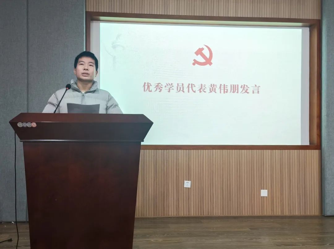 优秀积极分子学员代表黄伟朋发言。他分享了此次党课培训学习期间的收获与感悟,并代表全体入党积极分子郑重表态:坚持党员标准,绷紧“一根弦;牢记初心使命,守住“一颗心”;勇立时代潮头,担好“一条梁”。在日常的学习与生活中展现铁的作为、铁的担当,不忘初心,牢记使命。在学深悟透上下功夫、在知行合一上求实效,把人生的小我真正融入国家发展、民族进步、人民幸福的大我之中。