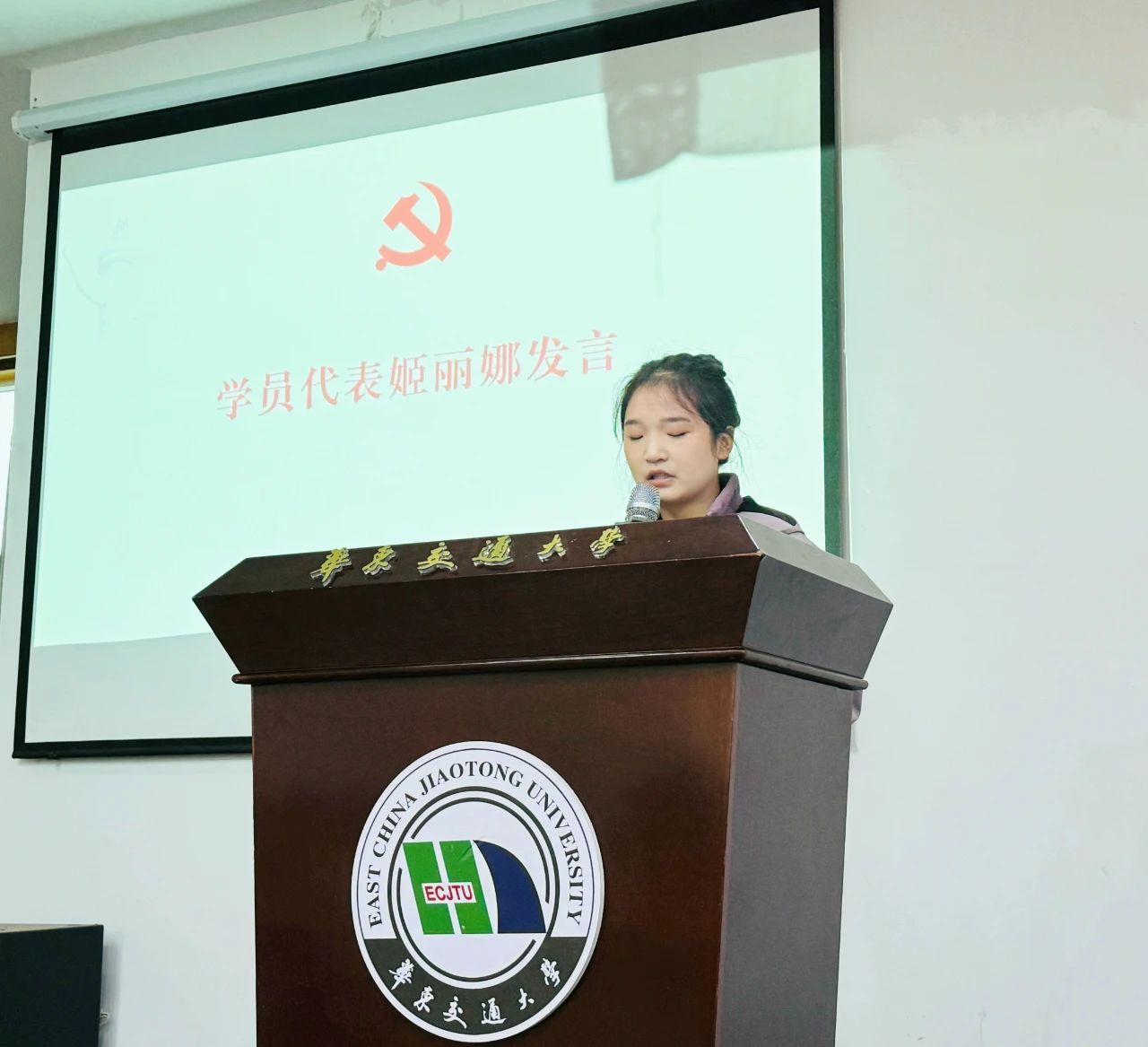 入党积极分子学员代表姬丽娜发言。她表示,要感恩学校及学院党委提供给我们机会与平台,要从思想、作风和行为上积极向党组织靠拢。党的光辉征程,是一部波澜壮阔的史诗,它见证了中华民族从苦难走向辉煌的壮丽篇章。作为入党积极分子,我们必须秉持庄重求实的学习态度,严格遵循各项培训规范,以此深化党性修养,锤炼坚强意志,提升政治素养,矢志不渝地投身于党的伟大事业之中。