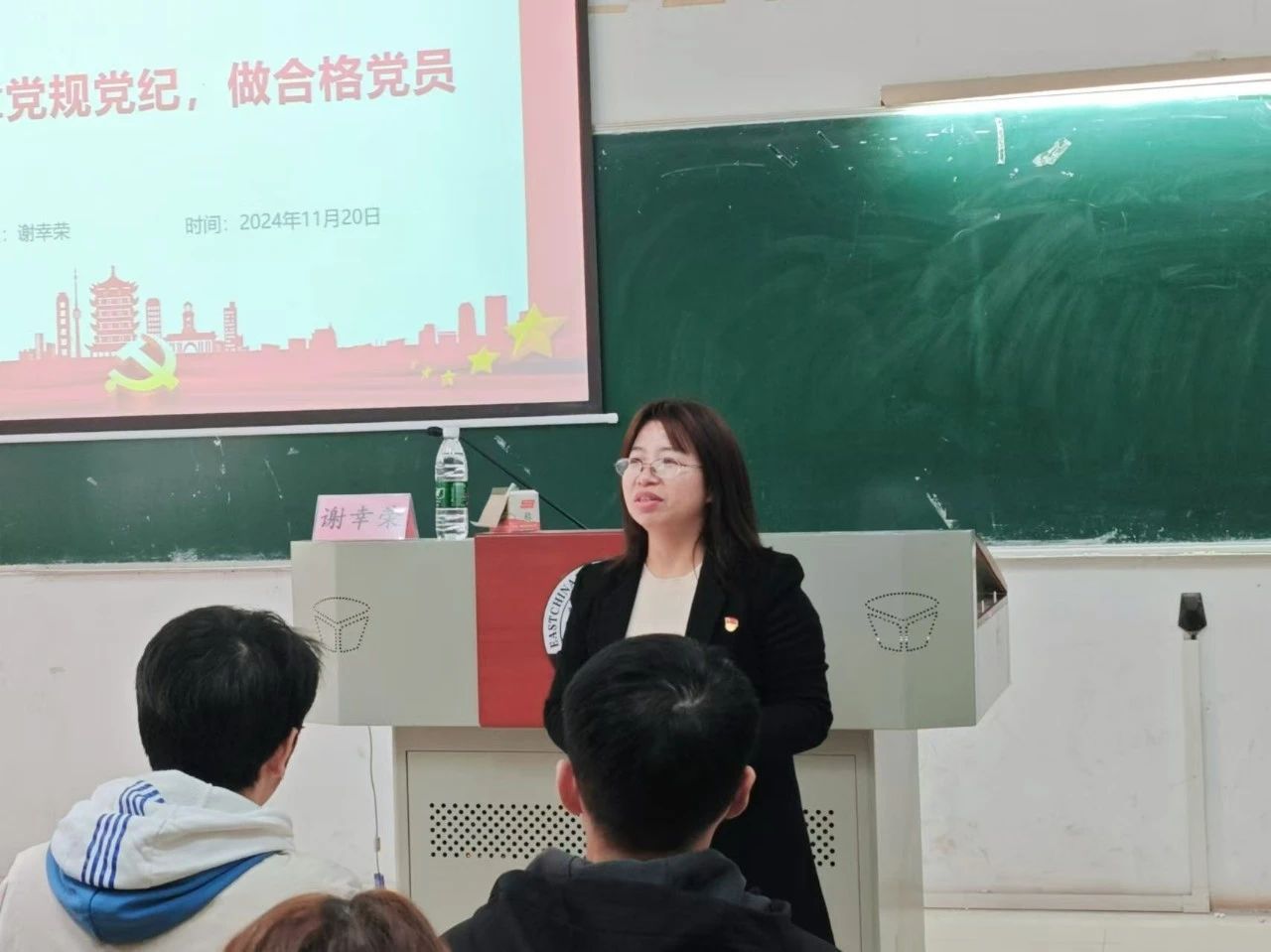 谢幸荣老师向同学们介绍了党的组织法规、党的领导法规、党的自身建设法规、党的监督保障法规的相关知识。她强调,党员需遵守《关于新形势下党内政治生活的若干准则》,这是为了维护党的政治生态健康,促进党的团结统一,加强对党员干部的思想政治教育,确保党能够有效发挥其在中国特色社会主义事业中的领导核心作用。