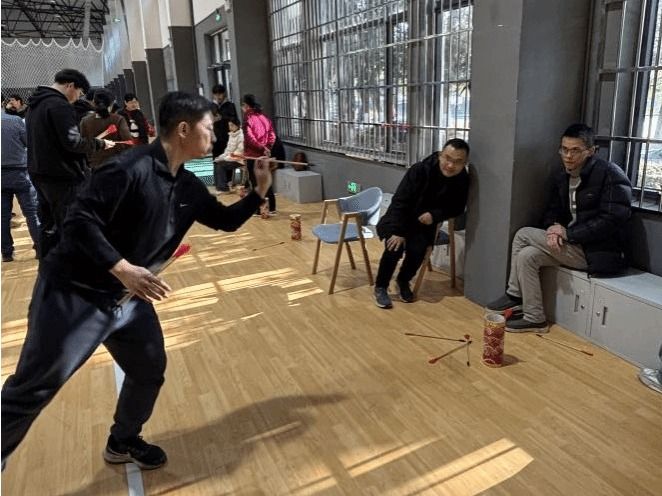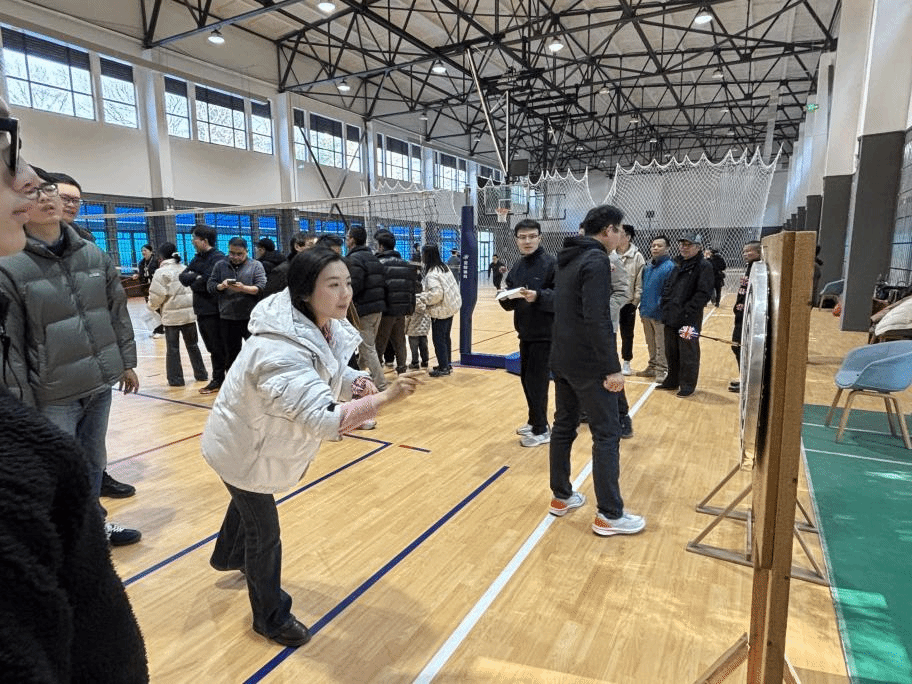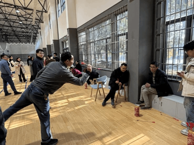 投壶环节,老师们按顺序排好队,每人8支箭,投入壶中,按8人总投入壶箭计数,多者胜。老师们站在距离壶有一定距离的投掷线后。他们手持箭形的投箭,瞄准前方的特制壶口。通过调整姿势和力度,将投箭以弧线形式投掷出去。整个游戏过程中,大家全神贯注,享受着投掷的乐趣和竞争的刺激,欢声笑语不断。