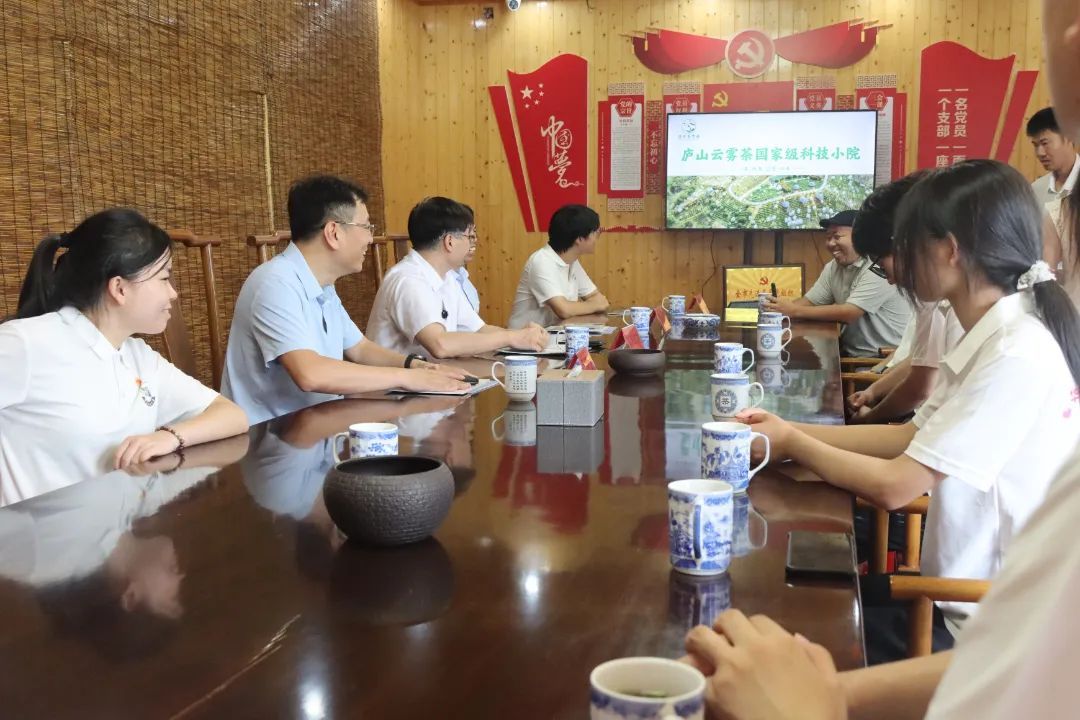 欧阳志刚一行走进庐山市海会镇海庐茶博园,调研当地茶旅融合经验做法,并与实践队队员一道,向海庐茶博园非遗传承人阚师傅学习茶文化,感受新时代茶文化的价值意蕴。欧阳志刚强调:“茶文化是中华优秀传统文化的重要组成部分,同学们要深入挖掘‘精行俭德’的茶文化哲学,在传承实践中厚植文化自信“。
