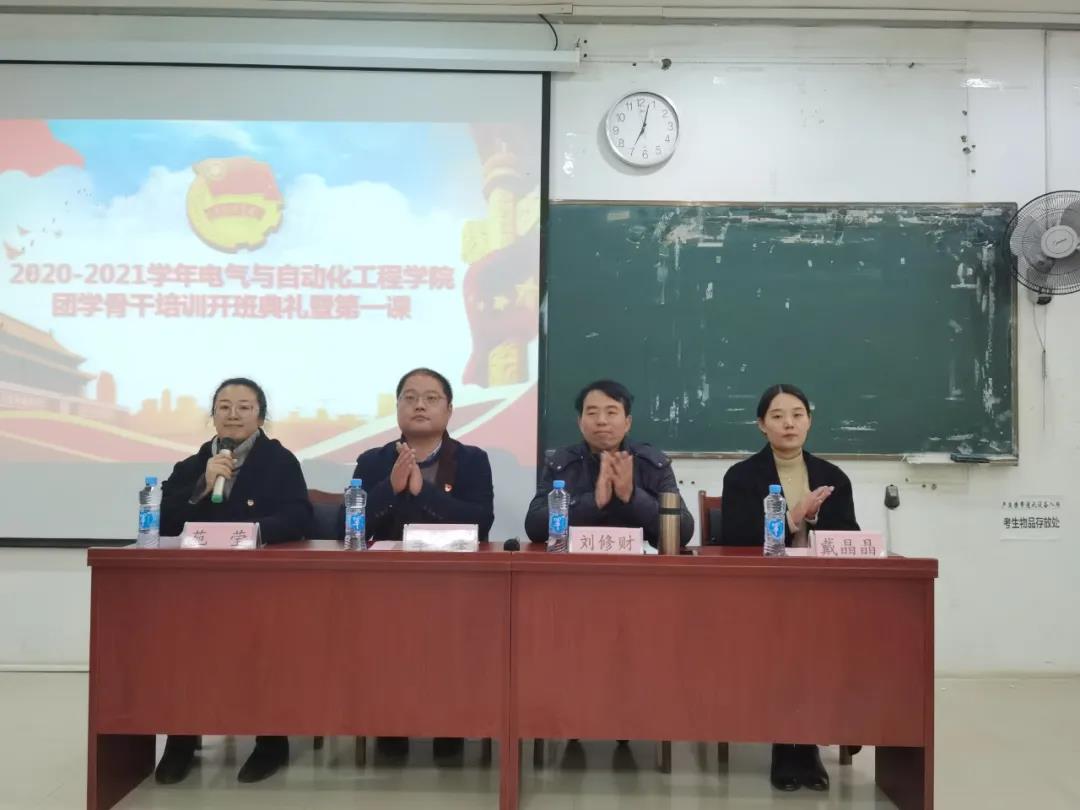 为提高团学骨干自身综合素质和工作能力,进一步加强团学骨干队伍和班级团支委队伍建设,更好地服务同学,12月2日晚,我院于教10栋举行2020-2021学年电气学院团学骨干培训第一期开班典礼暨团学骨干培训第一课。校团委书记李雪峰,电气学院党委副书记刘修财,学工办副主任兼团委副书记苑莹、戴晶晶出席本次大会。