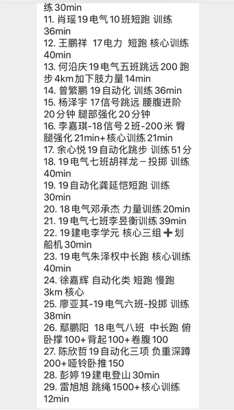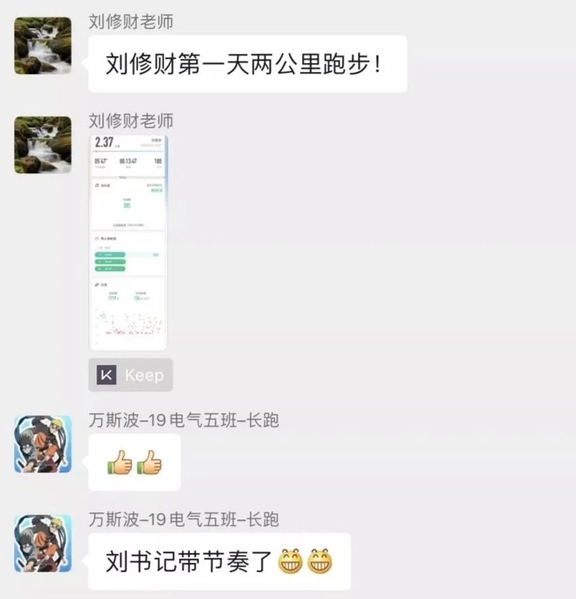 我院全体学生纷纷响应,“云锻炼”阵容不断扩大,锻炼方式层出不穷,有跑步、哑铃卧推、引体向上等毅力锻炼,有健腹轮、深蹲、平板撑等专项训练,有篮球、羽毛球、乒乓球等休闲娱乐,更有闲暇时打太极等修身养性的锻炼。每一位同学都在按时完成自己设立的目标,班群内皆是同学们分享的运动内容和心得体会。