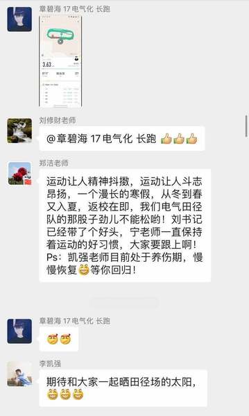 学工办主任兼团委书记郑洁也指出,锻炼让人精神抖擞,运动使人斗志昂扬,这是一个漫长的寒假,从冬到春又入夏,但现如今返校在即,望我院田径队始终坚持着运动时的干劲,保持经常运动的良好习惯。辅导员李凯强也表示,期待与各位同学一起晒田径场上的太阳。