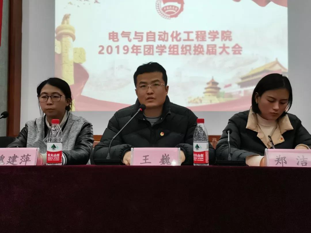 12月1日,我院于电气楼举办团学组织换届大会。院党委副书记王巍、学工办主任兼团委书记郑洁、学工办辅导员夏圣伟、魏建萍及2018-2019学年各团学组织学生干部代表和2019-2020学年各团学组织全体成员参加本次会议。