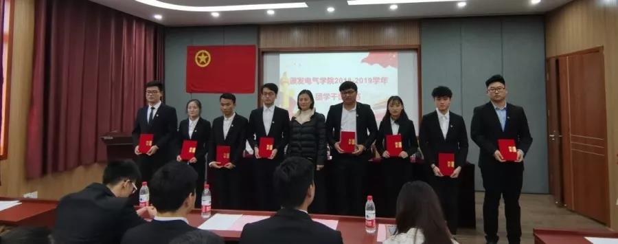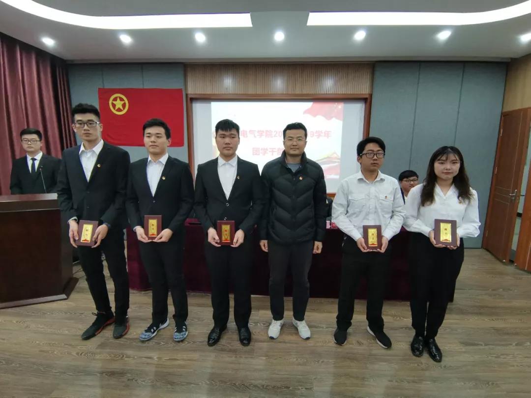 电气学院党委副书记王巍老师为电气学院2018-2019学年各团学组织负责人颁发聘书并合影留念;