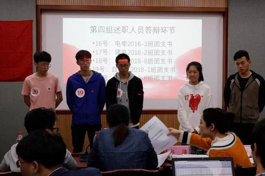 会中,我院部分班级团支部团干部代表进行述职,并由郑洁老师、苑莹老师、王新越、龚钰卓进行问辩、评分。
