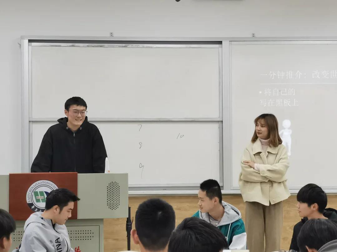 本次创业模拟分为三个阶段。第一阶段——奇思妙想。在沈诗妤老师的引导下,各小组成员结合日常生活中的新颖想法,确立创业项目,上台畅谈项目的内容及价值,随后集体投票选出五个最具吸引力和发展前景的项目。第二阶段——集思广益。上一阶段选出的五个项目负责人选择小组成员进行组队,并任命行政、财务主管及秘书等主要职位,经过成员内部共同协商讨论,初步确定项目方案。第三阶段——头脑风暴。各小组进一步补充完善项目内容和细节,共同模拟实际创业情景,并在三分钟内通过小品等表演形式进行情景模拟。经各小组投票评选,本次提升营最佳项目小组为“啊对对对”队的VR试衣。