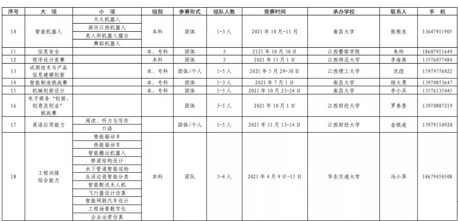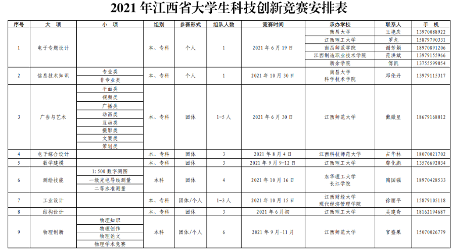 2.各项赛事定于今年4月至11月在有关高校陆续开展。具体竞赛项目、竞赛时间、竞赛地点等内容,详见附件“2021年江西省大学生科技创新竞赛安排表”。