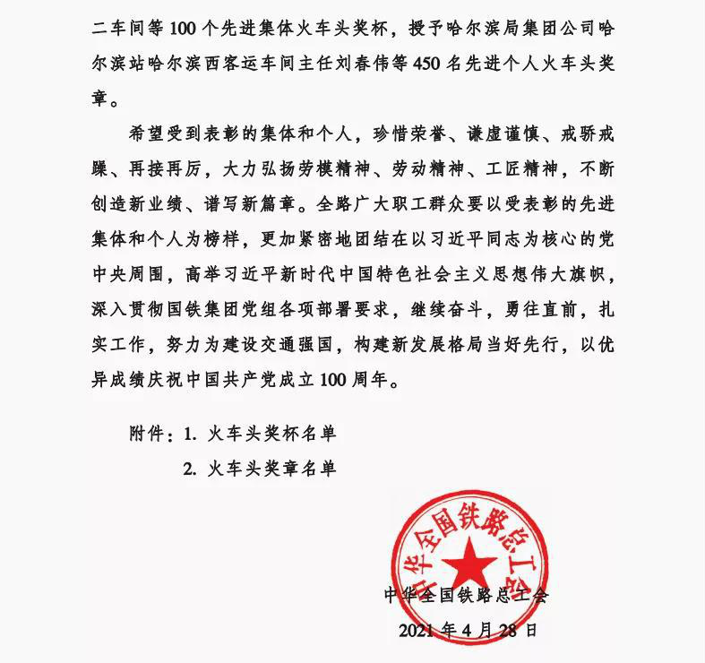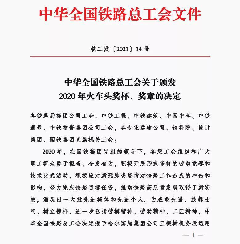 近日,中华全国铁路总工会公布了关于颁发2020年火车头奖章、奖杯的决定,我院1997级电牵专业校友韩宝剑荣获“火车头奖章”。