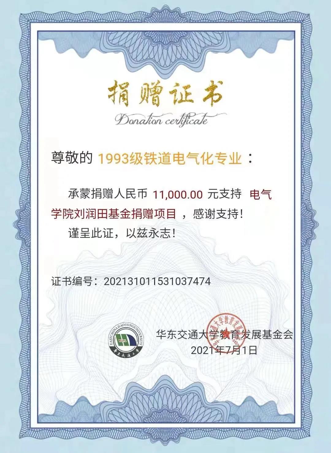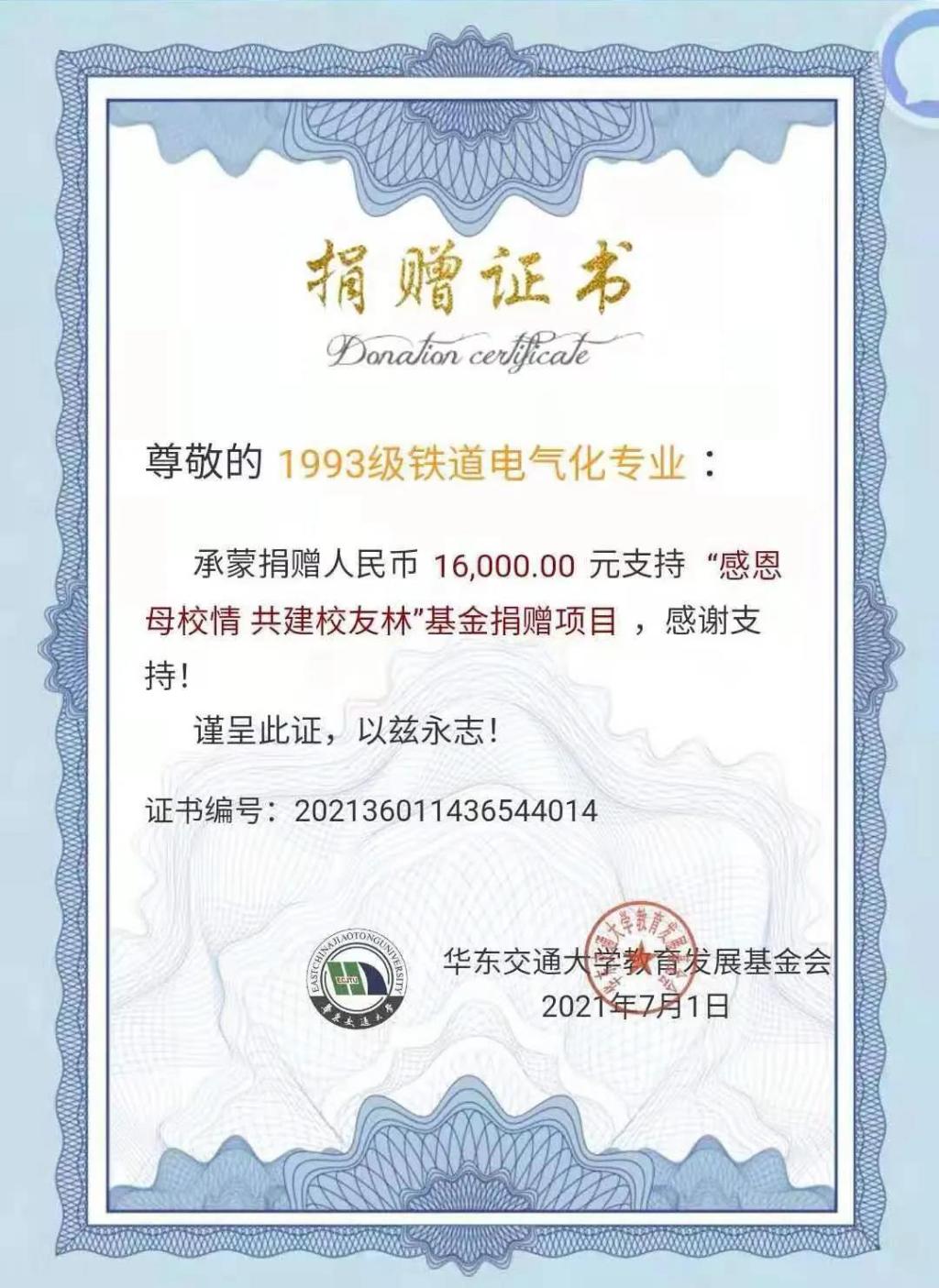 近日,1993级铁道电气化专业校友向学校捐赠了人民币16000元,以支持“感恩母校情 共建校友林”基金捐赠项目。同时,向学院捐赠了人民币11000元,以支持“6776永利集团刘润田基金捐赠项目”。